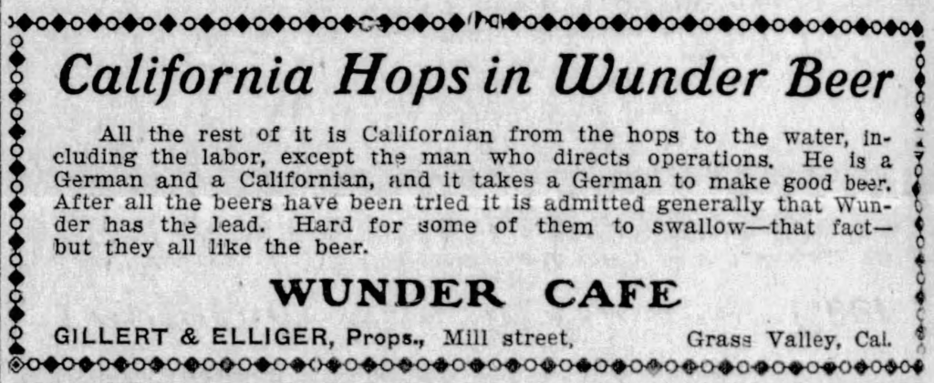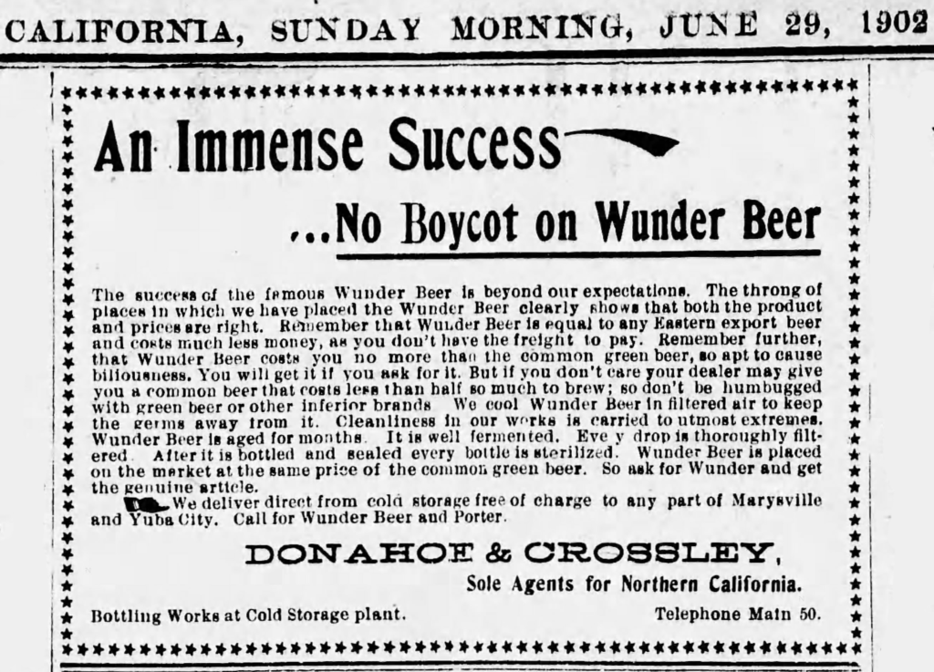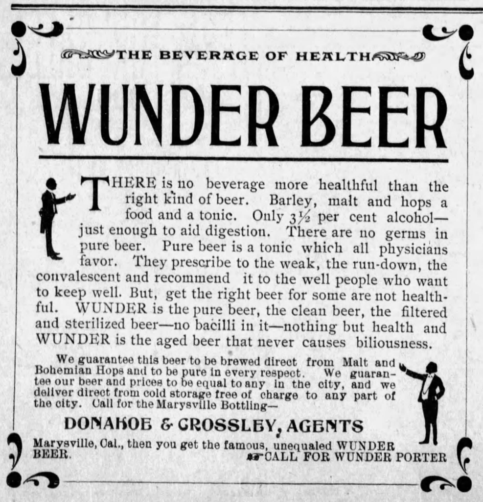 The Bavarian Brewery had been founded by Philip Frauenholz in 1852 at Vallejo & Green Streets in San Francisco, but later moved to Greenwich & Scott Streets. After buying the brewery in 1898, Wunder renamed it the Wunder Brewing Co. and it remained that until he closed in 1909. Somebody reopened it, sort of, under the name Wunder Beverages in 1930 at 830 Isabella Street and ran that until 1955.