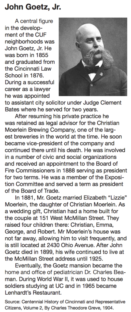 After Goetz married Lizzie Moerlein, he went to work for his father-in-law at one of Cincinnati’s biggest breweries, Christian Moerlein Brewing Co. In fact, before prohibition, it was one of the nation’s ten largest. But like many breweries, it was closed by prohibition, and wasn’t re-introduced until 1981. In 2004, the brand was purchased by Greg Hardman, a local resident of the Greater Cincinnati area, who also bought several other local beer brands in addition to Moerlein.