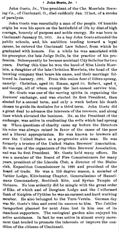 Today is the birthday of John Goetz, Jr. (January 28, 1855-January 23, 1898), who was married to Christian Moerlein’s daughter Lizzie and worked in his father-in-law’s brewery. He also organized the Brewers Exchange, and was its first president, a trustee in the U.S. Brewers Association, and helped organize the Ohio Brewers Guild.