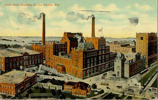 Gund and his three sons, George, Henry, and John Jr., continued to expand their brewery’s operations during the 1870s and 1880s. After John Gund incorporated the brewery in May 1880, he assumed the title of brewery president and his sons took other positions in the firm. The firm was capitalized at $100,000 (approximately $2.3 million dollars in 2011$) with the stock remaining in family hands. By 1887, the facility covered five acres and produced 45,000 barrels of beer annually. While this output still lagged behind the volume produced by major shipping breweries of the era such as Pabst, Schlitz, and Anheuser-Busch, when combined with the other breweries of La Crosse, the city’s beer production briefly surpassed the quantity produced by any other city in Wisconsin, including Milwaukee, in 1884. Given that La Crosse’s population was ten percent of Milwaukee’s population during this decade, such an output is impressive to say the least. Gund took advantage of La Crosse’s rail and river connection to the Upper Midwest and the Chicagoland area to distribute beer to the Dakotas, Minnesota, Iowa, Nebraska, and Illinois. Henry Gund served as a traveling agent for the firm and established a distribution center in Minneapolis in 1882.