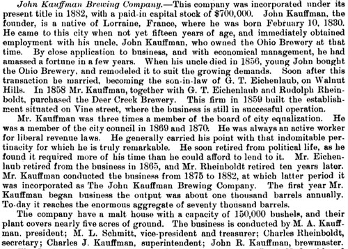 There’s an entry for the John Kauffman Brewery in the “History of Cincinnati and Hamilton County, Ohio,” published in 1894: