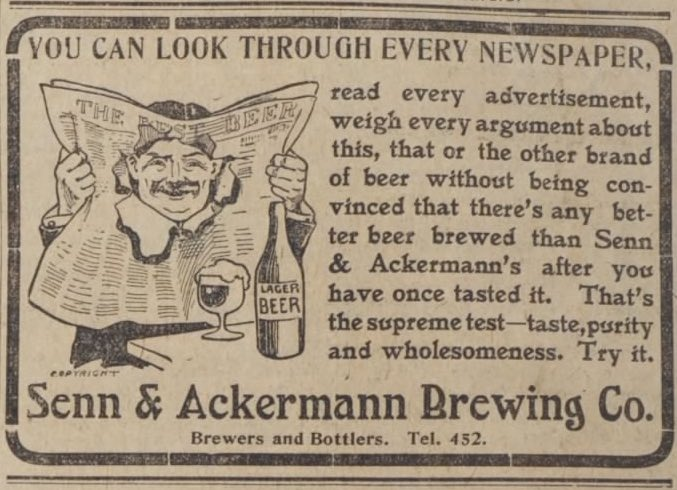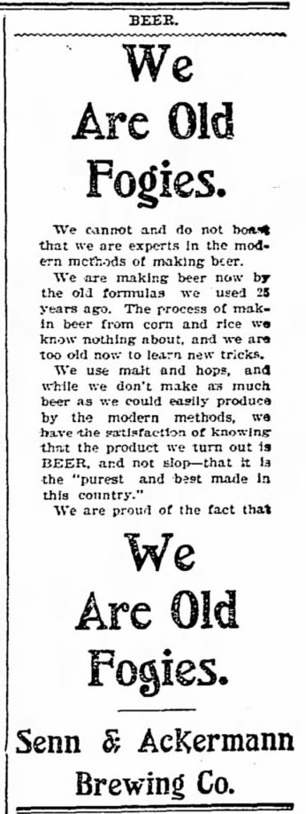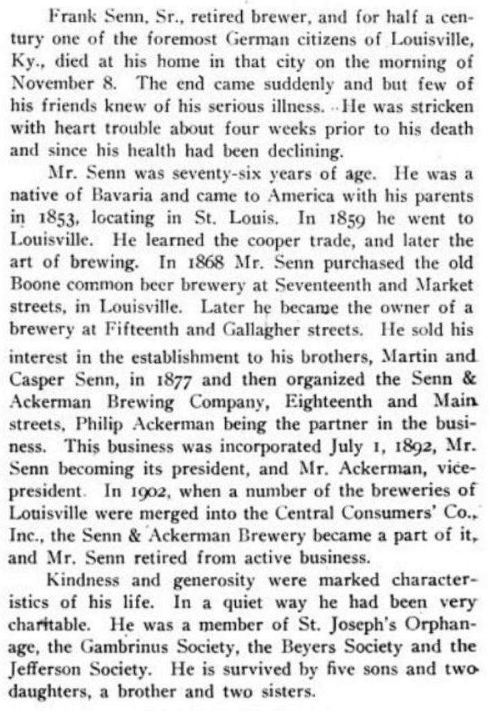 Today is the birthday of Frank Senn (February 2, 1838-November 8, 1913) who was born in Mechtersheim, Germany, which today is known as Römerberg, but settled in St. Louis, Missouri with his parents in 1853. In Louisville, Kentucky, he opened the Frank Seen Brewery in 1874, but later sold it to his two brothers. In 1877, he took with a partner, Philip Ackermann, he opened a new brewery, the Frank Senn & Philip Ackermann Brewery. In 1892, they shortened it to the Senn & Ackermann Brewing Co., which it remained until being closed by prohibition.