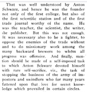 When the United States Brewers’ Academy celebrated its 25th anniversary, in 1913, there was a ball where several alumni gave speeches and toasts, mentioning Schwarz’ contributions, including this from Gallus Thomann from Germany: