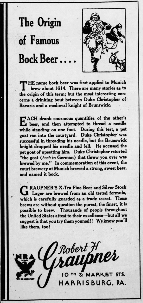 Thursday’s ad is for Graupner Bock Beer, which was published on August 28, 1933. This one was for the Robert H. Graupner Brewery of Harrisburg, Pennsylvania, which was originally founded in 1875 as Koenig & Bro. and was also often called the Centennial Brewery, though Graupner was usually in the name after 1893. They also mention two of the other beers, Graupner’s X-Tra Fine Beer and Silver Stock Lager. But what’s most curious about the ad is that most of it is taken up by the telling of one of the many origin stories of bock beer. This ad ran in The Harrisburg Telegraph, also of Harrisburg, Pennsylvania.