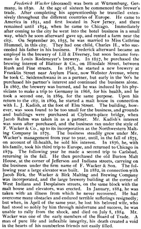 The Chicago brewery Frederick started was originally called Seidenschwanz & Wacker, and was located on Hinsdale, between Pine and Rush streets. It was founded in 1857, but the following year it became known as Wacker & Seidenschwanz, and was on N. Franklin Street. That version lasted until 1865. Beginning that same year, its name changed once again to the Frederick Wacker Brewery, and its address was listed as 848 N. Franklin Street, presumably in the same location as its predecessor. Sixteen years later, in 1882, it relocated to 171 N. Desplaines (now Indiana Street) and it became known as the Wacker & Birk Brewing & Malting Co. This is also when Charles joined his father’s business, when he would have been 26 years old. Just before prohibition the name was shortened to the Wacker & Birk Co., although it appears to have closed by 1920.