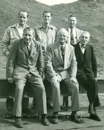 The Adolph Coors Company Board of Directors posing together at the dedication of the new headhouse at the brewery in Golden, Col., on April 16, 1952. Three men are standing and three men are seated on top of the headhouse. Standing in back left to right are brothers, William K. Coors, Joseph Coors, and Adolph Coors III. Seated in front left to right are brothers Grover Coors, Herman Coors, and Adolph Coors II (from the Golden History Museum).