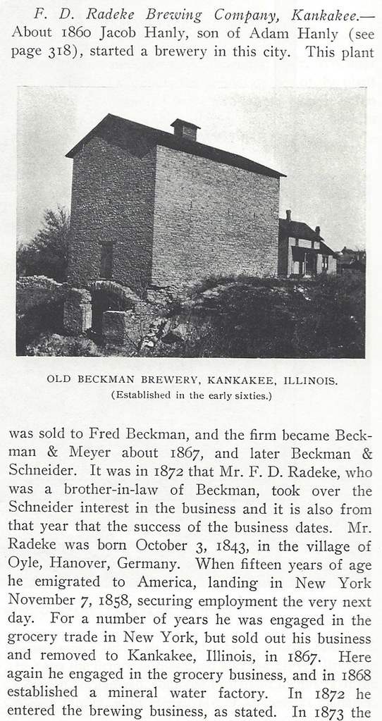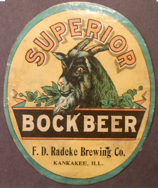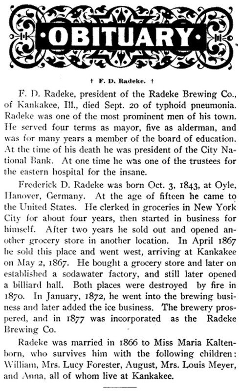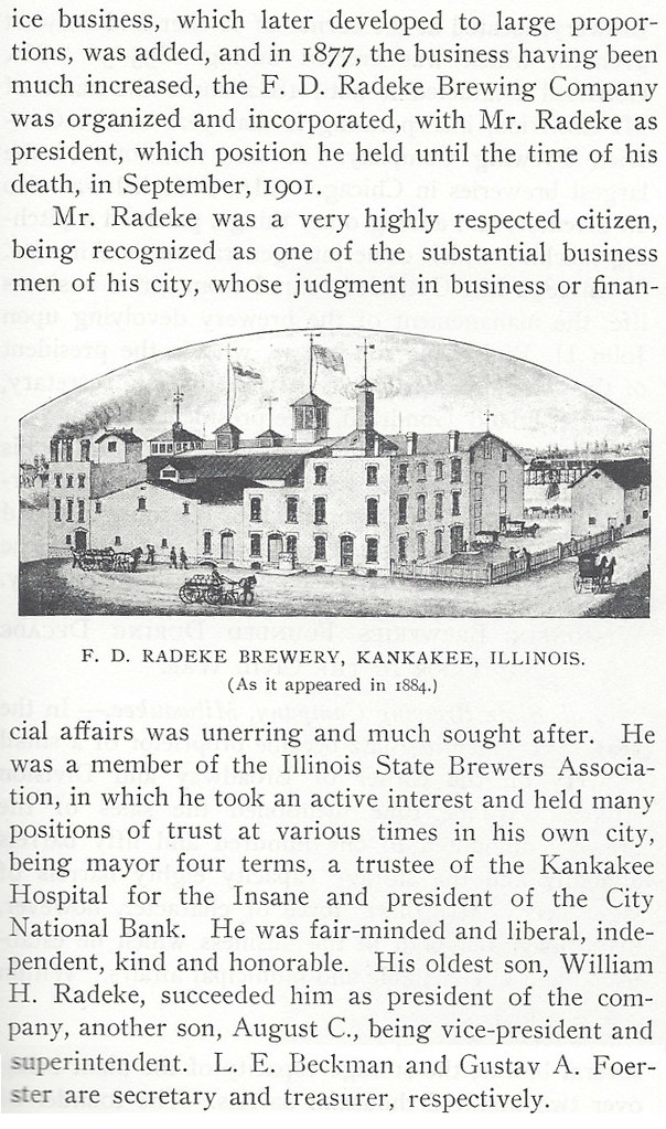 Today is the birthday of Frederick D. Radeke (October 3, 1843-September 24, 1901). He was born in Oyle, Hanover, Germany, but came to America when he was 24, in 1867, settling in Kankakee, Illinois. He initially became a grocer, but when it burned down, he joined his brother-in-law in the brewery business he’d bought, and by 1873 it had been reorganized as the F. D. Radeke Brewing Co. It was closed by prohibition, reopened under a series of names after repeal, but closed for good in 1937.