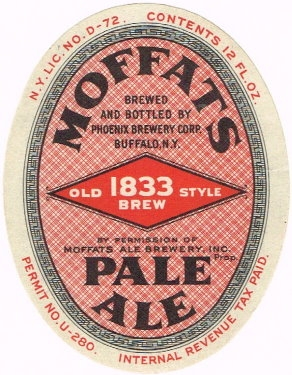 Kane, Peacock and Relay brewery was short lived however and a 1909 article in the Buffalo Evening Times indicates John Moffat and his son James purchased the brewing operation around 1833. Also, the 1836 Buffalo City Directory lists Moffat as a brewer at that location. The 1839 Directory lists James Moffat & Co. as a “Brewery, Soap and Candle Factory”. The Moffat Brewery continued in operation until son James died and it was sold to Arthur Fox and became the Fox and Williams Brewery. In 1876 it was sold back to the Moffat family and continued in operation at the same location until the advent of Prohibition forced their closure in 1920. After Prohibition the Phoenix Brewery continued brewing “Moffats Pale Ale” through an agreement with the Moffat family.