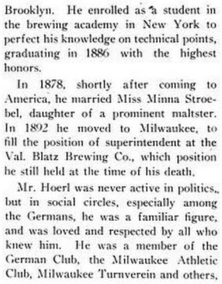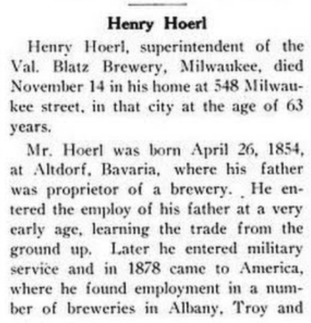 Today is the birthday of Henry Hoerl (April 26, 1854-November 14, 1917). He was born in Altdorf, in Bavaria, Germany, the son of a German brewery owner, where he learned the trade. When he was 24, he came to the U.S. and found employment with a number of breweries throughout New York. In 1892, he moved to Milwaukee, Wisconsin to become the Superintendent of the Val. Blatz Brewing Co. a position he held for the rest of his life.