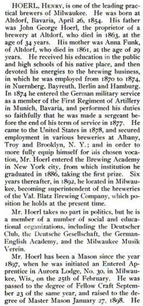 Henry Hoerl, for many years a prominent figure in the brewing circles of Milwaukee, has achieved his prominence through untiring energetic effort. He is of German descent and was born at Altdorf, Bavaria, Germany, April 26, 1854, the son of George and Anna (Funck) Hoerl, natives of the famous old city of Nuremberg. Henry, the subject of this review, received his education in the elementary schools of his native city and then took a course in the high school. After finishing his studies he was employed in breweries in Germany for several years. He served with distinction in the German army as sergeant of artillery of a Munich regiment. Ambitious to rise in the world and recognizing the greater possibilities and advantages offered in this country to young men of energy and determination, he left his home in 1878, when twenty-four years of age, and set out for the new world, entering upon a career in the course of which he encountered many disappointments, to ultimately reap the reward of honest efforts in abundant prosperity. Soon after landing in New York he found employment in the breweries there and took the brewmaster’s course in the New York Brewing Academy, winning the first prize in 1886. This brought him into prominence among the brewing men of the city and he secured an excellent position. In 1892 he moved to Milwaukee to become superintendent of the Valentine Blatz Brewing Company and has made their beer famous. On June 4, 1878, Mr. Hoerl married Katherine, the daughter of Michael and Katherine (Neuner) Strobel, of Albany, N. Y. Four children have come to bless this union: Emil, who is the proprietor of the Germania brewery of Altoona, Pa. ; Jenny, John M., who resides in Milwaukee, and Annie, the wife of George Schott, who runs a cooperage works in Cincinnati, Ohio. Mr. and Mrs. Hoerl are communicants of the Lutheran church, to which their ancestors have belonged for many generations. Mr. Hoerl is affiliated with the Masonic Order, having taken the Bine Lodge, the Chapter, Knights Templar and Consistory degrees, and he is also a member of the Mystic Shrine. Hoerl is a popular member of the Deutscher Club, the Millioki Club, the Milwaukee Music Vercin and the “West Side Turn Verein.”