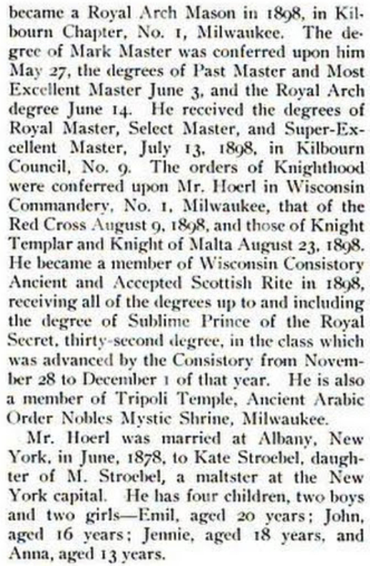 This biography of Henry Hoerl is his entry from “Freemasonry in Wisconsin: Biographical Sketches of Men who Have Been Prominent in the Various Masonic Bodies in the State,” published in 1900.