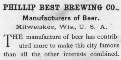 The article went on to explain that demand for Best beer was not only “constantly increasing” locally but also across the whole nation: “Everybody has tasted Best’s beer, and it’s very generally acknowledged to be the best in the country.” Although the article certainly exaggerated the national impact of Best’s beer at mid-century, the company had begun to sell their brands outside Wisconsin in the early 1850s when it established a sales office in Chicago, Illinois. While Milwaukee and the surrounding region provided the main market for Best products throughout the second half of the nineteenth century, this early effort to serve the national and – beginning in the 1860s – international market was a distinctive feature of the company’s development.