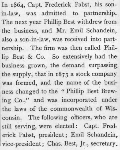 Today is the birthday of Phillip Best (September 26, 1814-July 17, 1869) Phillip Best was the son of Jacob Best, who founded the brewery that eventually became Pabst Brewing Co., with his four sons in 1844. The Best family’s business was originally called “The Empire Brewery,” and then it was “Jacob Best & Sons Brewery” until 1859 when Phillip Best took over the firm and renamed it the “Phillip Best Brewing Company.” Upon Phillip’s retirement Frederick Pabst and Emil Schandein became the company’s president and vice-president in the mid-1860s and the brewery’s name was amended to Phillip Best & Company. After Schandein died, the company was renamed the Pabst Brewing Company in 1889.