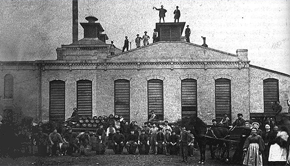 As production increased, the company acquired and built new facilities. In 1850, the family purchased a lot on Market Street between Biddle and Martin Streets (today East Kilbourn Avenue and East State Street). Five years later, the company built a new brick house on Market Street with a beer hall on the ground floor, and in 1857 it erected a new main brewery on the north side of Chestnut Street between Ninth and Tenth Streets with large storage cellars. The Milwaukee Sentinel reported on October 9, 1857, that the brewery had the “deepest cellars in the city” and it may be seen from almost any part of the city. The building is a fine looking one, and were it not for a life-sized figure of a sturdy Teuton which is perched on top, in the act of sipping a glass of lager, one would never suspect its being a brewery. It has much more the appearance of a public building of some sort.
