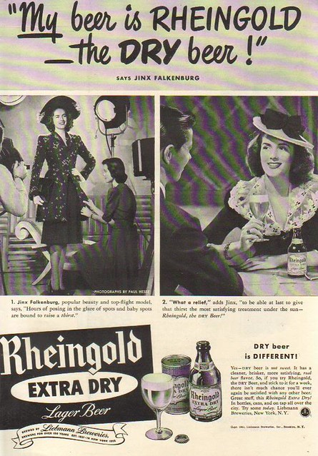 Today is the birthday of Jinx Falkenburg, who was a minor actress in the 1930s-40s, but a major model. Originally a beauty queen from Barcelona, Spain (some accounts say Chile), her real claim to fame was being chosen as the first Miss Rheingold in 1939. By all accounts, the Miss Rheingold Contest evolved into one of most successful beer promotions of all time, and in its heyday was as popular as the Miss America Pageant. Women would be nominated and whittled down to six. Then the public would vote for their favorite. The winner was then the spokesmodel for Rheingold for the following year and her likeness was on their beer can along with a lot of their advertising.