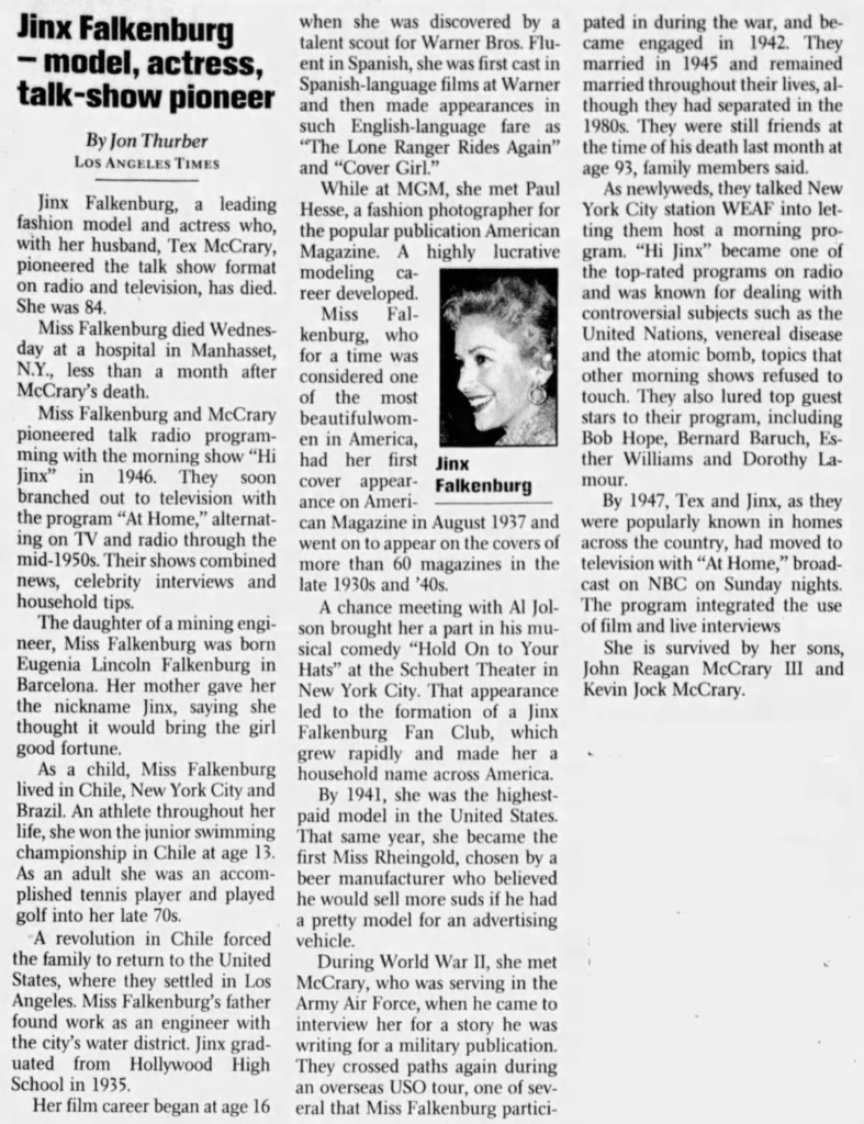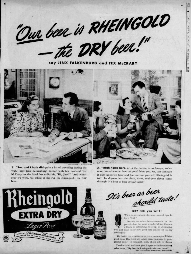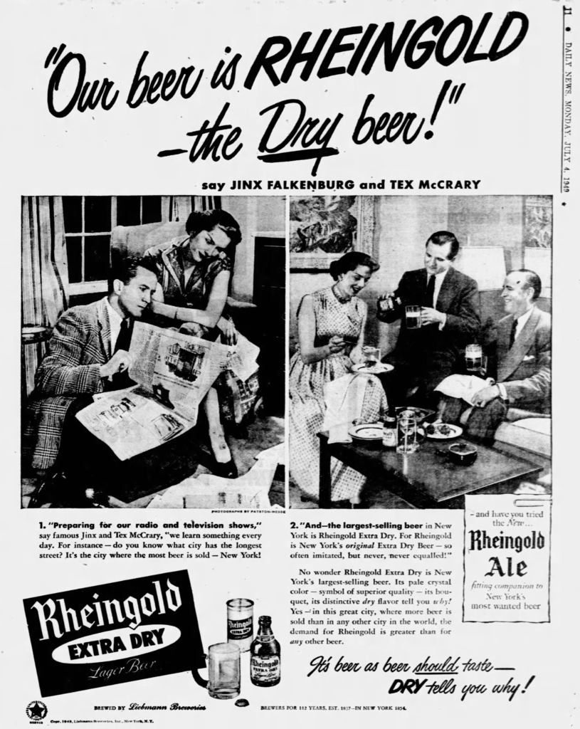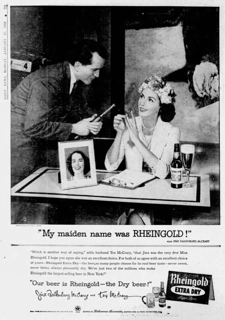 Jinx married Tex McCrary, who “was an American journalist and public relations specialist who invented the talk show genre for television and radio, and appeared on radio and TV with his wife, Jinx Falkenburg.” Below is an ad for Rheingold they did together in 1949.
