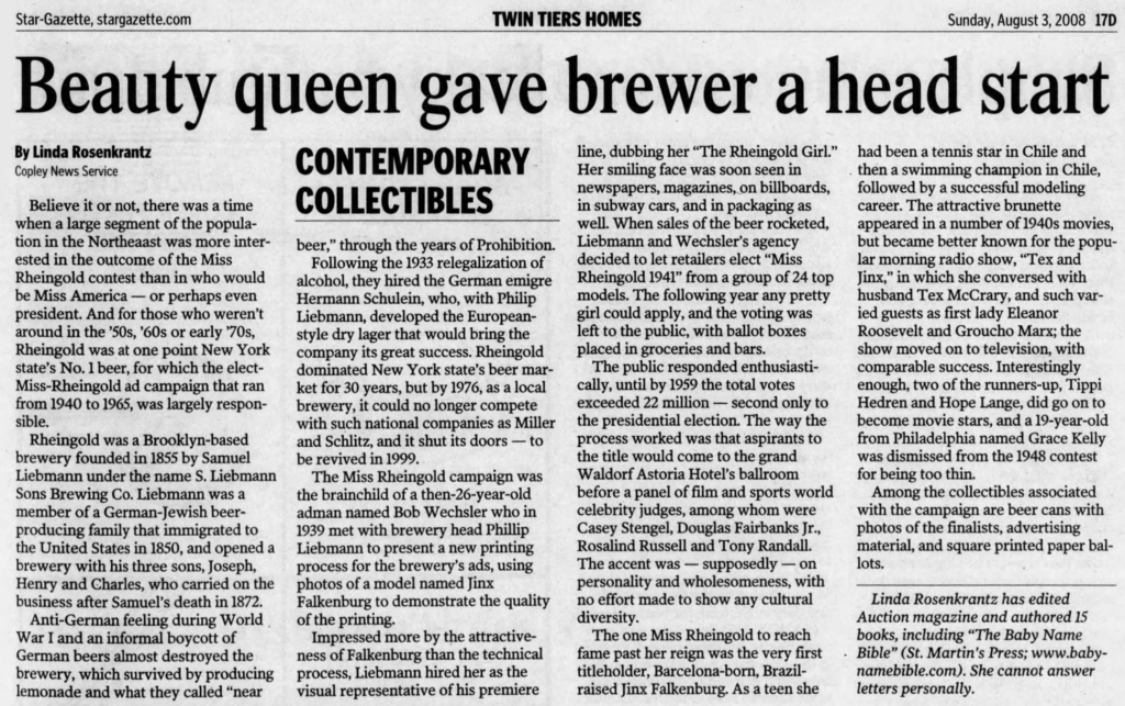 Here’s the story of how she became the first Miss Rheingold, from a 2008 newspaper article: