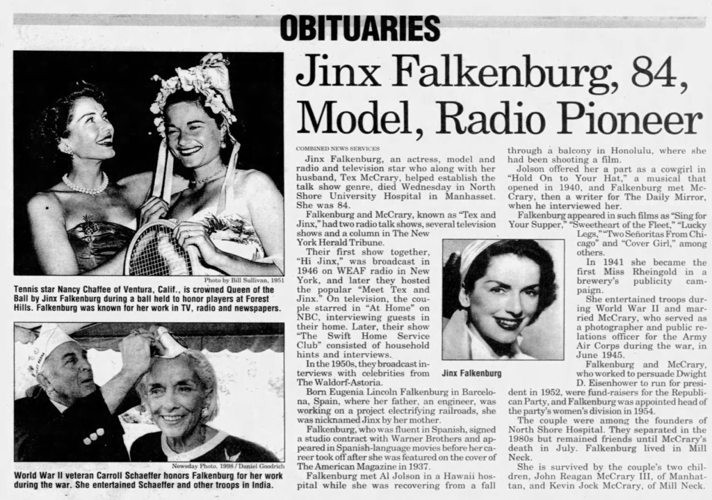 Falkenberg passed away in 2003. Here’s her obituary from the Newsday’s Nassau Edition: