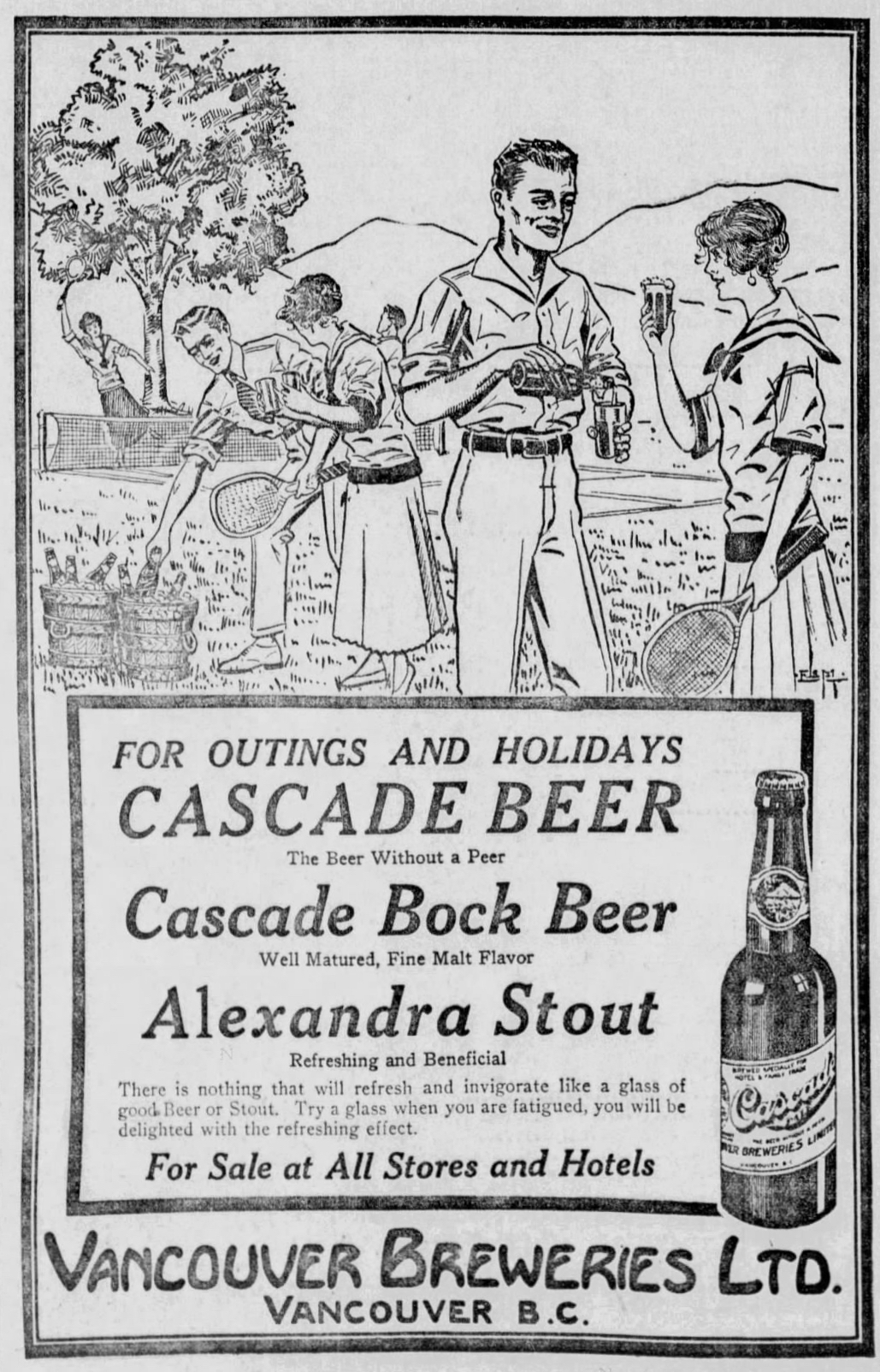 Monday’s ad is for Cascade Bock Beer. The ad was published on June 2, 1918. This one was for Vancouver Breweries Ltd., of Vancouver, British Columbia, which was originally founded in 1902 by a merger. This ad ran in The Vancouver Sun, of Vancouver, British Columbia, Canada.